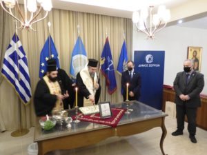 Την ακολουθία του Αγιασμού και την κοπή της πατροπαράδοτης αγιοβασιλειόπιτας, τέλεσε σήμερα, Πέμπτη 13 Ιανουαρίου 2022, ο Σεβ. Μητροπολίτης Σερρών και Νιγρίτης κ. Θεολόγος, κατόπιν σχετικής προς τούτο προσκλήσεως, στο Δημαρχείο Σερρών, παρουσία του Δημάρχου Σερραίων κ. Αλ. Χρυσάφη, του Προέδρου, των μελών του Δημοτικού Συμβουλίου Σερρών και των εργαζομένων στις υπηρεσίες του Δήμου.