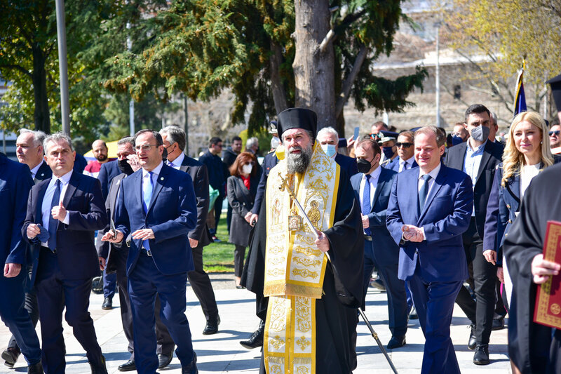Ακολούθως, στις 11:00 π.μ., εψάλη η επίσημη Δοξολογία για την επέτειο της ηρωϊκής Επαναστάσεως των Ελλήνων για την ελευθερία της Πατρίδος μας, στον ιερό Μητροπολιτικό Ναό Παμμ. Ταξιαρχών Σερρών, με την παρουσία του Υπουργού Υποδομών και Μεταφορών κ. Κ. Καραμανλή, των Βουλευτών του Νομού Σερρών κ. κ. Φ. Αραμπατζή, Θ. Λεονταρίδη, Κ. Μπούμπα και Ελ. Αβραμάκη, του Αντιπεριφερειάρχου Σερρών κ. Π. Σπυροπούλου, του Δημάρχου Σερραίων κ. Αλ. Χρυσάφη, του Διοικητού του 10ου Συντάγματος Πεζικού Σερρών κ. Χ. Σγουρομάλλη, του Διοικητού της Αστυνομικής Διευθύνσεως Σερρών κ. Ευαγγ. Τσιώτα, αντιπροσωπειών της Πρωτοβαθμίου και Δευτεροβαθμίου Εκπαιδεύσεως Σερρών με τις γαλανόλευκες σημαίες, καθώς και Πολιτιστικών Συλλόγων με τις παραδοσιακές φορεσιές και τα λάβαρά τους.