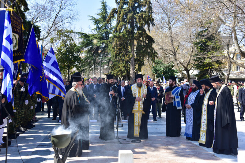 Μετά το πέρας της Δοξολογίας, εψάλη επιμνημόσυνη δέηση, κατετέθησαν στέφανοι, τηρήθηκε ενός λεπτού σιγή στη μνήμη όλων όσων θυσιάσθηκαν για την ελευθερία της Πατρίδος μας και εψάλη ο Εθνικός μας Ύμνος, ενώπιον του ανδριάντος του Σερραίου ήρωος της Ελληνικής Επαναστάσεως, Αρχιστρατήγου Εμμ. Παπά, στον χώρο της πλατείας «Ελευθερίας» Σερρών.