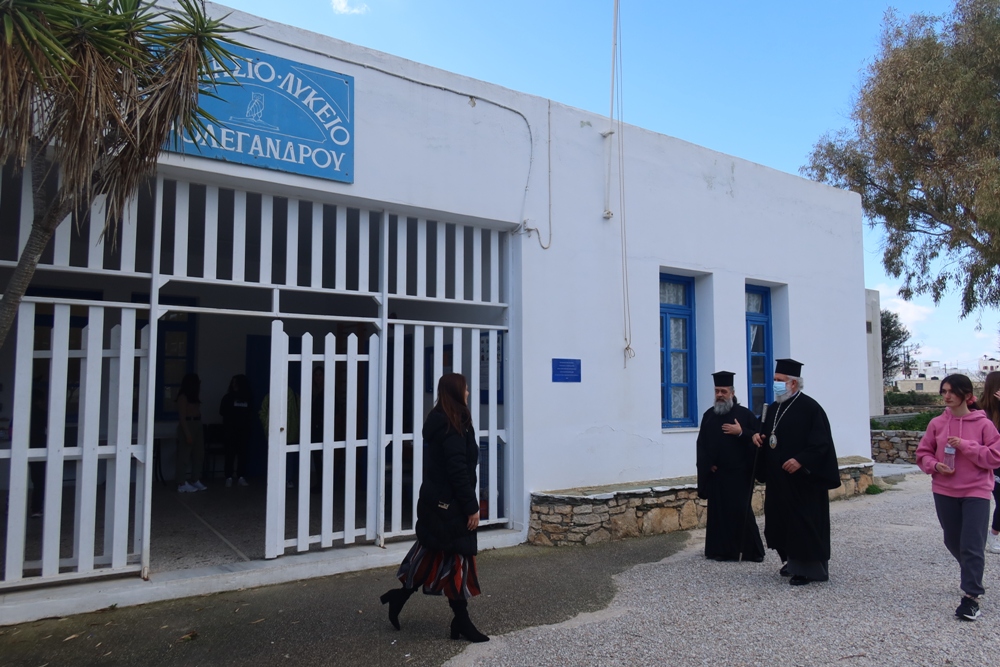 Στη συνέχεια, ο Σεβασμιώτατος κ. Δωρόθεος Β΄ επισκέφθηκε το Δημοτικό Σχολείο και ακολούθως το Γυμνάσιο με Τάξεις Λυκείου Φολεγάνδρου, γενόμενος δεκτός με εκδηλώσεις τιμής και σεβασμού από τους Εκπαιδευτικούς, τους οποίους συνεχάρη για το έργο τους, και τους μαθητές, με τους οποίους συνομίλησε και προς τους οποίους διένειμε δώρα και ευλογίες.