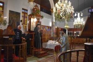 Ο ιερέας της ενορίας π. Βασίλειος Ανδρονικίδης μαζί με το εκκλησιαστικό συμβούλιο, ο πρόεδρος τού χωριού κ. Ιωάννης Γκόγκας και άλλοι ενορίτες, ορισμένοι ντυμένοι παραδοσιακά, συγκεντρώθηκαν νωρίς το πρωί στον προαύλιο χώρο τού ναού τού Αγίου Νικολάου για να υποδεχθούν τον νέο Ποιμενάρχη.