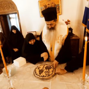 Εισερχομένου του Σεβασμιωτάτου στο Καθολικό της Μονής εψάλη δοξολογική και ευχαριστιακή δέηση, ενώ στην συνέχεια στο Αρχονταρίκι της Μονής, ο κ. Συμεών ευλόγησε την Βασιλόπιτα της Αδελφότητος και ευχήθηκε στην Γερόντισσα Ιουστίνα και την Μοναχή Αναστασία έτη πολλά, ευλογημένα και η νέα χρονιά να φέρει υγεία και πνευματική πρόοδο.