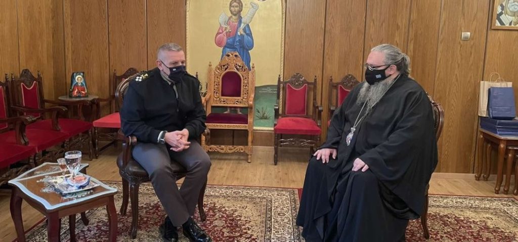 Ο Σεβασμιώτατος υποδέχθηκε εγκαρδίως τον κ. Αρχηγό, τηρώντας αμφότεροι τα ασφαλή μέτρα προφύλαξης που έχει συστήσει η Ελληνική Πολιτεία, και τον ευχαρίστησε για την αμέριστη συμπαράσταση και αγάπη που επιδεικνύει στην τοπική Εκκλησία.