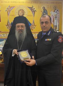 Ο Σεβασμιώτατος προσέφερε ως ευλογία στον κ. Πετρούτσο, ιερά εικόνα του Αγίου Αποστόλου Ανδρέου, ενώ ο κ. Πετρούτσος έδωσε τιμητικά στον Σεβασμιώτατο, τον θυρεό της Πυροσβεστικής.