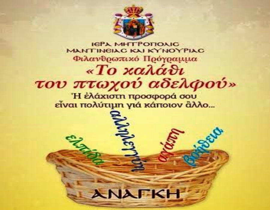 Εν αναμονή της μεγάλης εορτής της Γεννήσεως του Σωτήρoς Ιησού Χριστού, η Ιερά Μητρόπολη Μαντινείας και Κυνουρίας αναγνωρίζοντας την τεράστια πλέον ανάγκη υποστήριξης συνανθρώπων που πλήττονται σκληρά από την ανεργία και την φτώχεια αλλά και την λοιμική νόσο του κορωνοϊού και στο πλαίσιο του Φιλανθρωπικού Προγράμματος «ΤΟ ΚΑΛΑΘΙ ΤΟΥ ΠΤΩΧΟΥ ΑΔΕΛΦΟΥ», διοργανώνει εκστρατεία συγκέντρωσης τροφίμων και ειδών πρώτης ανάγκης. Η συγκέντρωση των προσφορών αυτών θα πραγματοποιηθεί την Κυριακή 12 Δεκεμβρίου 2021, στον Μητροπολιτικό Ιερό Ναό Αγίου Βασιλείου Τριπόλεως (πλατεία Αγίου Βασιλείου, έμπροσθεν του Ιερού Παρεκκλησίου της Αγίας Μακρίνας) από τις 10 το πρωί μέχρι τις 2.00 το μεσημέρι.