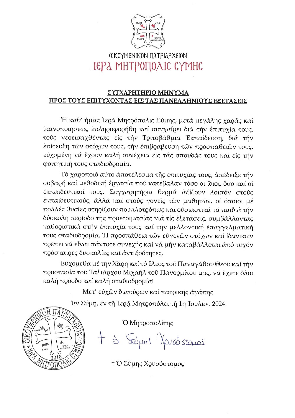 Ο Μητροπολίτης Σύμης κ. Χρυσόστομος προς τους επιτυχόντες των Πανελλαδικών Εξετάσεων