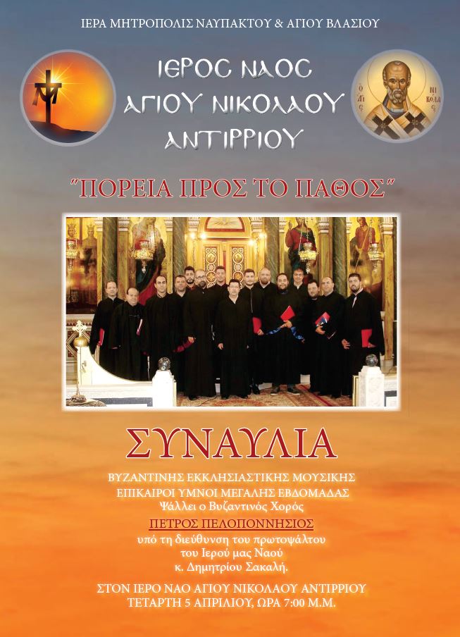 Συναυλία Εκκλησιαστικής Μουσικής θα πραγματοποιηθεί στον Ι. Ν. Αγίου Νικολάου Αντιρρίου, στη Μητρόπολη Ναυπάκτου, σήμερα, Τετάρτη 5 Απριλίου, στις 19:00 μ.μ., σύμφωνα με το κάτωθι Πρόγραμμα: