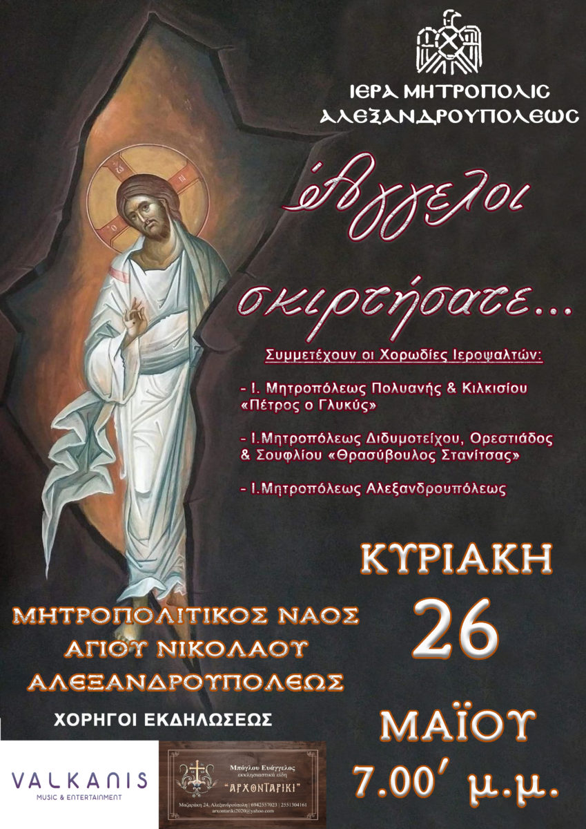 Την προσεχή Κυριακή 26 Μαΐου στις 7.00’ το απόγευμα θα πραγματοποιηθεί εντός του Μητροπολιτικού Ναού του Αγίου Νικολάου, Συναυλία Βυζαντινής Εκκλησιαστικής Μουσικής με τίτλο «Άγγελοι σκιρτήσατε…», με ύμνους της περιόδου του Πάσχα.