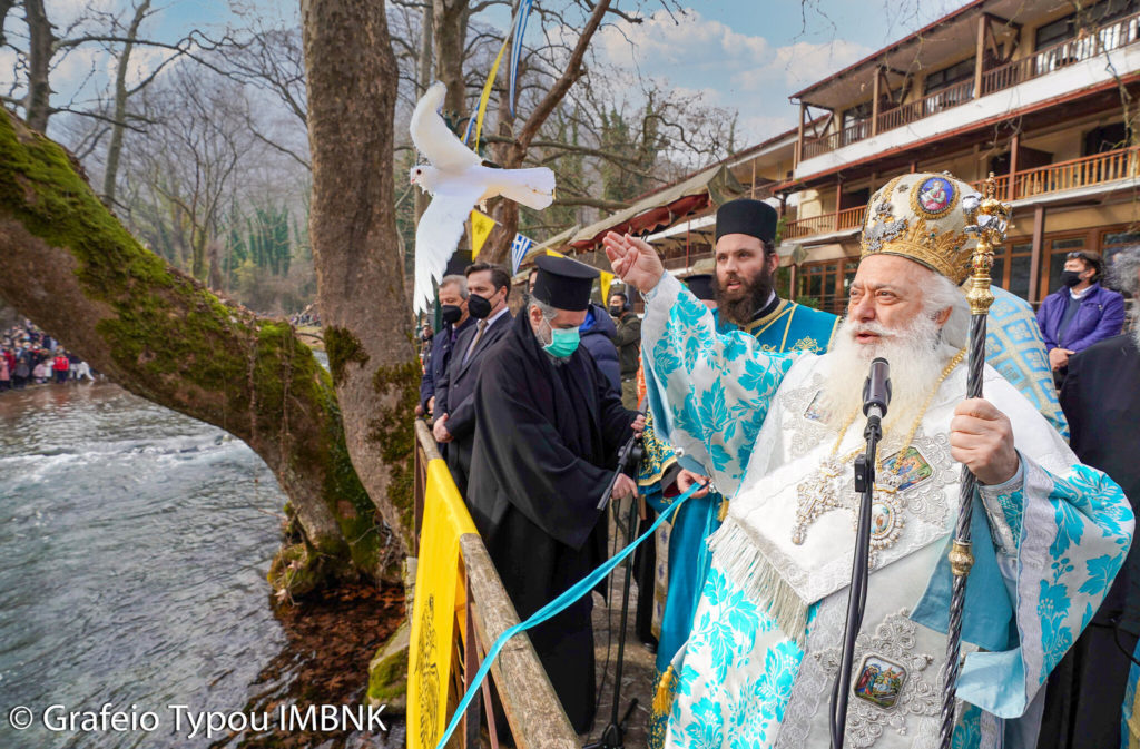 Στο τέλος τελέστηκε στον αύλειο χώρο του Προσκυνηματικού Ναού η Ακολουθία του Μεγάλου Αγιασμού, ενώ ακολούθησε ο καθαγιασμός των υδάτων στον ποταμό «Τριπόταμο» της πόλεως.