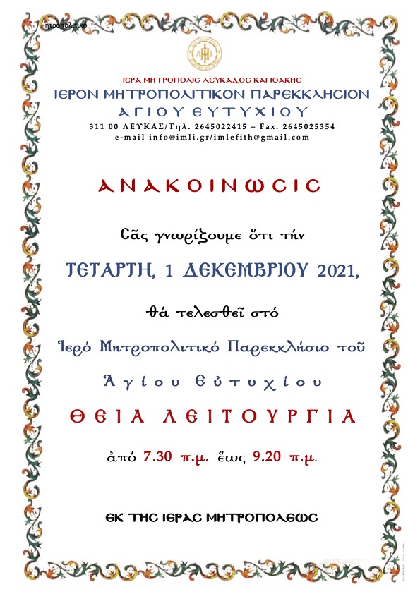 Θεία Λειτουργία θα τελεστεί στο Ιερό Μητροπολιτικό Παρεκκλήσιο Αγίου Ευτυχίου, της Ι. Μητροπόλεως Λευκάδος, την Τετάρτη, 01 Δεκεμβρίου 2021, σύμφωνα με το Πρόγραμμα: