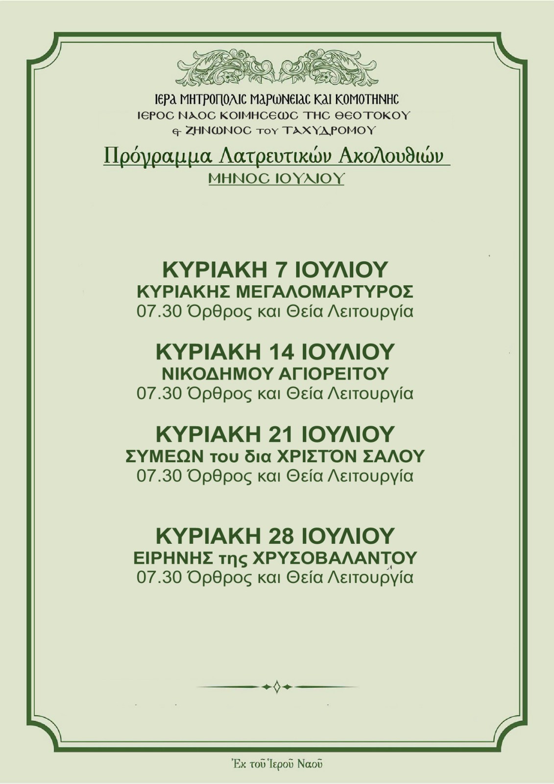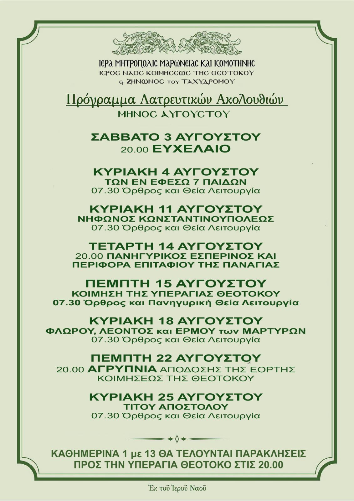 Ἐπισυνάπτεται τὸ Πρόγραμμα Λατρευτικῶν Ἀκολουθιῶν: