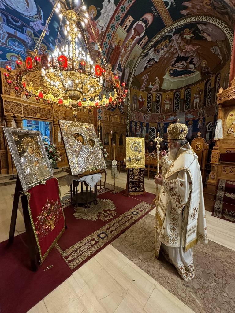 Κατά την διάρκεια δε της ιεράς λιτανείας ανέπεμψε δεήσεις και ευχές στον «Κύριο Παντοκράτορα» «…του βρέξαι και όμβρον δούναι καρποφόρον ημίν…». Μουσική Στρατιωτική Μπάντα και ένοπλο Τιμητικό Στρατιωτικό Άγημα απέδιδαν τιμές. Ο Σύλλογος διατήρησης ιστορικών οχημάτων Κρήτης, ευγενώς προσφερόμενος, μετέφερε με ιδιόκτητα αυτοκίνητα τις Ιερές Εικόνες. Προ της Απολύσεως της Ιεράς Αγρυπνίας ο Επίσκοπος μας ευχαρίστησε τον Πρωτοσύγκελλο της Ι.Μητροπόλεως, Παν. Αρχ. π. Αγαθάγγελο, «δια την οργάνωση και συντονισμό», τους Προϊσταμένους του Ι. Μητροπολιτικού Ναού και του Ι. Καθεδρικού Ναού του Αγ. Σπυρίδωνος ως και τους Κληρικούς της Ι. Μητροπόλεως, τον Υφυπουργό Εθνικής Αμύνης κ. Ιωάννη Κεφαλογιάννη «δια την φροντίδα ελεύσεως της Στρατιωτικής Μουσικής Μπάντας και του Τιμητικού Αγήματος» και, απευθυνόμενος στο πλήθος των πιστών που είχαν κατακλύσει τον Ι. Μητροπολιτικό Ναό, πολλοί εκ των οποίων μετείχαν της Θείας Κοινωνίας, σημείωσε: «Πρόγευση της μεγάλης εορτής της Σεπτής Κοιμήσεως και της εις Ουρανούς μεταστάσεως της Θεοτόκου Μαρίας, η πνευματική χαρά, το ιερό – μυστικό αυτό πανηγύρι που, τις ημέρες αυτές ζούμε και χαιρόμαστε, με κορύφωση την σημερινή Ιερά Θεομητορική Αγρυπνία, ενώπιον των Χαριτοβρύτων Εικόνων της Παναγίας μας. Η μεγάλη και γλυκιά Μάνα του κόσμου καλεί όλους μας, και τώρα και πάντοτε, να καθρεπτιστούμε στο Πανάχραντο Πρόσωπο Της και να ζήσουμε, να ζούμε, την πίστη μας και την ζωή μας, με το μέτρο της δικής Της ζωής. Ας γίνει το σημερινό μας προσκύνημα, στις τρεις Χαριτόβρυτες και περίπυστες Εικόνες Της, απαρχή για ένα νέο πνευματικό ξεκίνημα, μια νέα σχέση ζωής, με την Πηγή της Ζωής, την Θεοτόκο Μαρία», κατέληξε ο Σεβ. Μητροπολίτης μας κ. Αμφιλόχιος, ευχόμενος «Καλή Παναγιά».