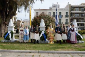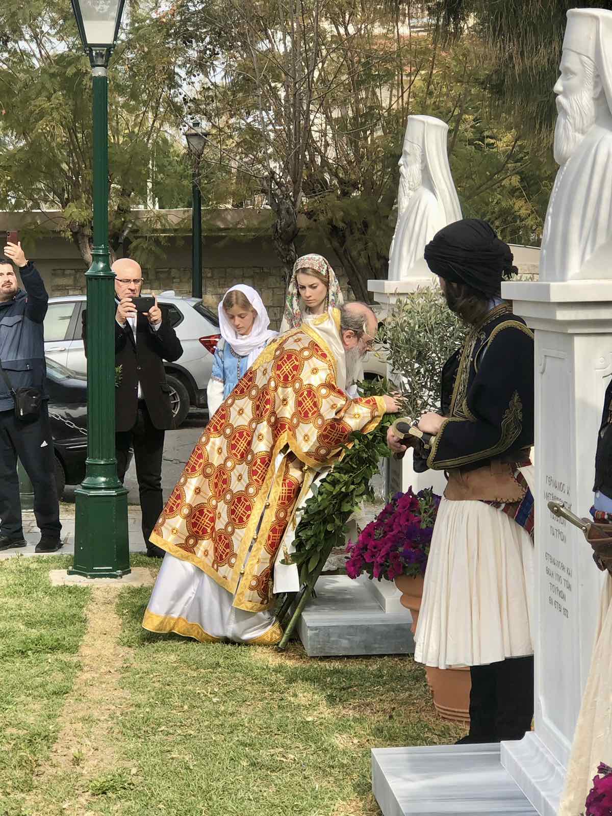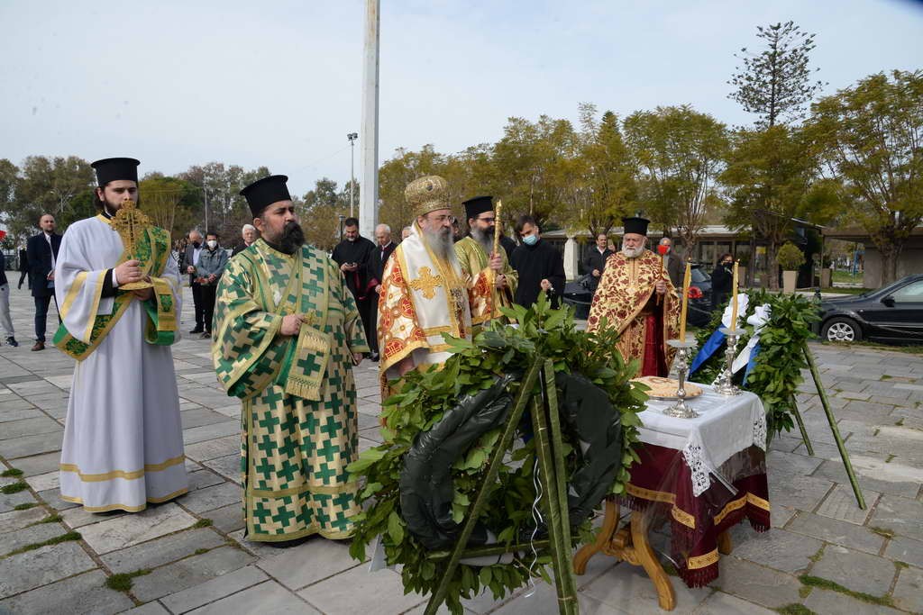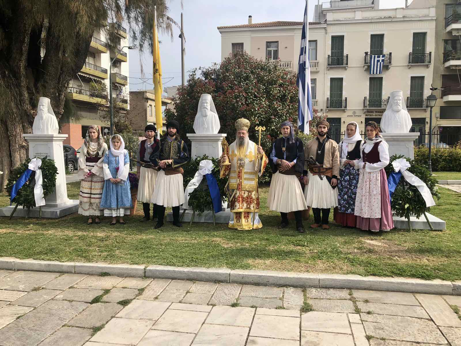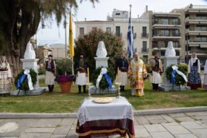 Μετά την Θεία Λειτουργία σχηματίσθηκε πομπή η οποία κατέληξε στις προτομές των Εθνομαρτύρων Αρχιερέων, όπου αναπέμφθηκε επιμνημόσυνη δέηση και κατετέθησαν στέφανοι, από τον Σεβασμιώτατο Μητροπολίτη Πατρών κ. Χρυσόστομο.