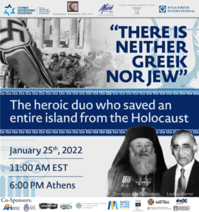 Ενόψει της Παγκόσμιας Ημέρας Μνήμης του Ολοκαυτώματος, την 27η Ιανουαρίου, θα πραγματοποιηθεί την Τρίτη 25 Ιανουαρίου 2022, στις 18:00, ειδική διαδικτυακή εκδήλωση με τίτλο «Οὐκ ἔνι Ἰουδαῖος οὐδὲ Ἕλλην», για να τιμηθούν η στάση και οι ηρωικές ενέργειες του Μακαριστού Μητροπολίτη Ζακύνθου κυρού Χρυσοστόμου και του Δημάρχου Λουκά Καρρέρ που είχαν ως αποτέλεσμα τη διάσωση ολόκληρης της εβραϊκής κοινότητας της Ζακύνθου από το Ολοκαύτωμα και να συνδεθεί η γενναιότητά τους με τον σύγχρονο αγώνα κατά του αντισημιτισμού.