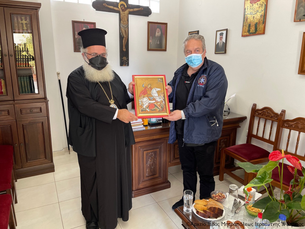 Ο Σεβασμιώτατος υποδέχθηκε τον κ. Γιαννακουδάκη και τους συνεργάτες του, στο πλαίσιο της επίσκεψης που πραγματοποίησε ο επικεφαλής της Υπηρεσίας Άμεσης Βοήθειας Κρήτης στο Ε.Κ.Α.Β Ιεράπετρας, και τους ξενάγησε στους χώρους του του ιστορικού και εμβληματικού μνημείου της πόλης. Ο κ. Διευθυντής ενημέρωσε επιγραμματικά τον Σεβ. για τη λειτουργία του Κέντρου στην περιοχή της Ιεράπετρας αλλά και της Σητείας.