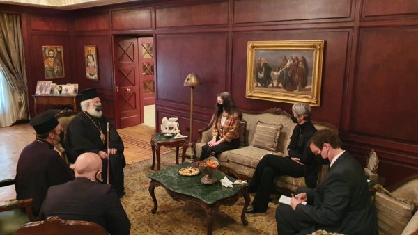 Ο Πάπας και Πατριάρχης Αλεξανδρείας και πάσης Αφρικής κ.κ. Θεόδωρος B’, υποδέχθηκε την αναπληρώτρια Πρέσβη των Η.Π.Α στο Κάιρο κα. Nicole Shampaine, καθώς και τον Υπουργό Δημοσίων σχέσεων της Πρεσβείας κ. Lauren Lovelace, παρουσία του Πατριαρχικού Επιτρόπου Αλεξανδρείας, Σεβ. Μητροπολίτου Πηλουσίου κ. Ναρκίσσου και του Θεοφιλ. Επισκόπου Νειλουπόλεως κ. Νικοδήμου.