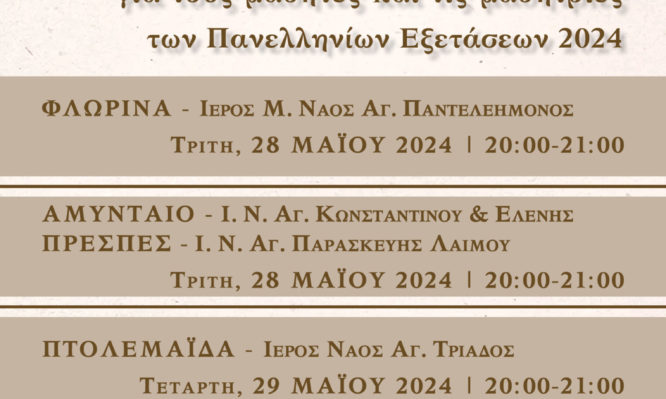 Η Ιερά Μητρόπολή μας, συμμετέχουσα στην αγωνία και τις προσπάθειες των μαθητών και των μαθητριών μας για την επιτυχή έκβαση της συμμετοχής τους στις Πανελλήνιες Εξετάσεις και την εισαγωγή τους στην Τριτοβάθμια Εκπαίδευση, διοργανώνει ως προσευχητική δράση την τέλεση βραδινής Θείας Λειτουργίας, ώστε να ενισχύσουμε τους νέους και τις νέες μας με την ελπίδα και τη χαρά τού αναστάντος Χριστού, τη φώτιση του Αγίου Πνεύματος, αλλά και την προσωπική μας παρουσία και επικοινωνία.