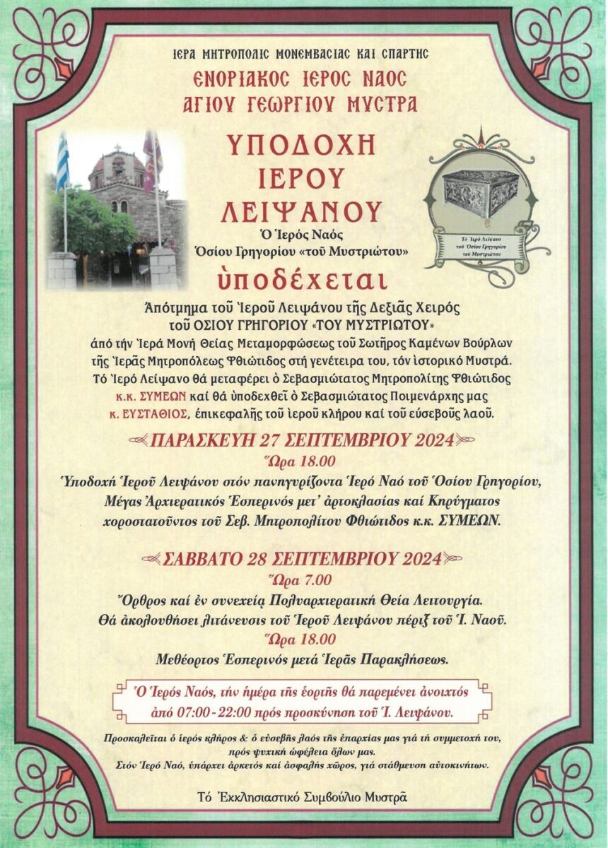 Η προσεχής Παρασκευή 27 Σεπτεμβρίου 2024 είναι μία σημαντική ημέρα για την Ιερά Μητρόπολη Μονεμβασίας και Σπάρτης, καθώς στον Ιερό Ναό Οσίου Γρηγορίου του Μυστριώτη θα γίνει, με εκκλησιαστική μεγαλοπρέπεια, η υποδοχή αποτμήματος της Δεξιάς Χειρός του Οσίου Γρηγορίου, που προέρχεται από την Ιερά Μονή Θείας Μεταμορφώσεως του Σωτήρος Καμένων Βούρλων.
