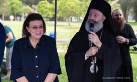 Ο Αρχιεπίσκοπος Αυστραλίας Μακάριος και η Λίνα Μενδώνη σε εκδήλωση των Κατηχητικών της Νέας Νοτίου Ουαλίας