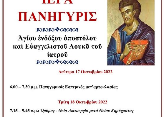 15 Οκτωβρίου 2022 12:22 Μητρόπολη Δημητριάδος: Μνήμη Αγίου Ευγγελιστού Λουκά στη Νέα Ιωνία Με την προσήκουσα θησκευτική ιεροπρέπεια η Μητρόπολη Δημητριάδος θα τιμήσει και φέτος τη μνήμη του Αγίου Ευαγγελιστού Λουκά
