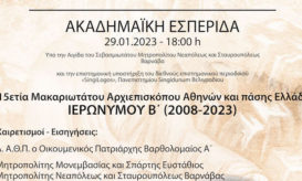 Η εσπερίδα θα ξεκινήσει στις 18:00, παραμονή της Εορτής των Τριών Ιεραρχών, Προστατών της Παιδείας και των Γραμμάτων. -