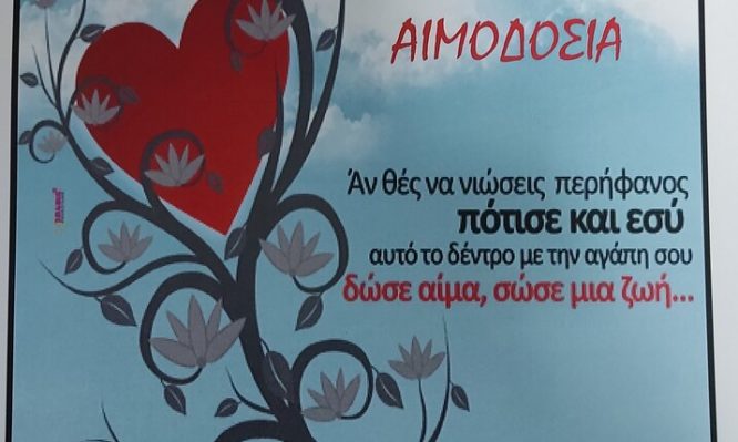 Η Αιμοδοσία θα ξεκινήσει στις 09:00 π.μ. και θα ολοκληρωθεί στις 13:00 μ.μ.