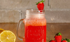 Βάζουμε τις φράουλες καθαρισμένες σε ένα μπλέντερ μαζί με τη ζάχαρη και το νερό και πολτοποιούμε. Προσθέτουμε το χυμό...