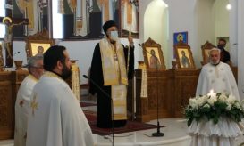Η ακολουθία τελέστηκε στον προαύλιο χώρο, διότι ο ναός έχει υποστεί μεγάλες ζημιές από τον σεισμό της 27ης Σεπτεμβρίου. -