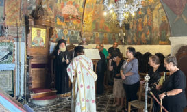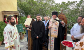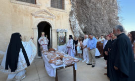 Στο τέλος της Λειτουργίας ο Σεβ. κ. Κύριλλος ευλόγησε τους άρτους στο προαύλιο του Καθολικού της Μονής και ευχήθηκε... -