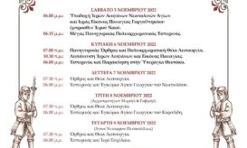 Την Κυριακή 6 Νοεμβρίου 2022 (7.00 π.μ.) θα τελεστεί Αρχιερατικό Συλλείτουργο και εν συνεχεία θα πραγματοποιηθεί η καθιερωμένη Λιτάνευση... -