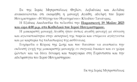 Εκδημία Μοναχής στη Μητρόπολη Θηβών
