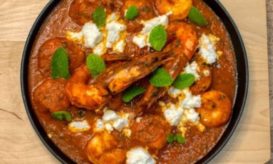 Ξεφλουδίζουμε τις γαρίδες κρατώντας την ουρά και το κεφάλι. Σε μια κατσαρόλα ασπρίζουμε το κρεμμύδι με το λάδι, ρίχνουμε... -
