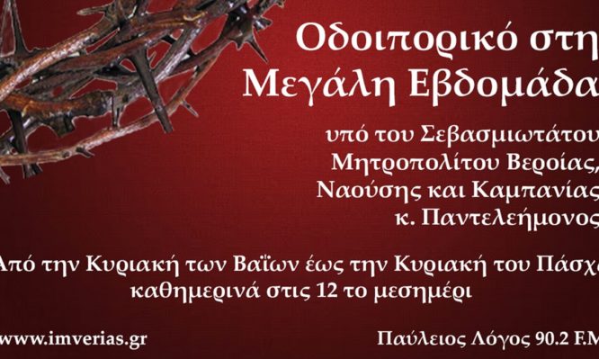 14 Απριλίου 2022 13:26 Οδοιπορικό στη Μεγάλη Εβδομάδα με τον Βεροίας Παντελεήμονα «Οδοιπορικό στη Μεγάλη Εβδομάδα", ξεκινά την Κυριακή των Βαΐων η καθημερινή σειρά ομιλιών από τον Βεροίας Παντελεήμονα.