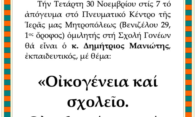 Οι συναντήσεις της «Σχολής νέων γονέων και ζευγαριών» πραγματοποιούνται κάθε Τετάρτη στις 7:00 μ.μ. στον Ιερό Μητροπολιτικό Ναό των...