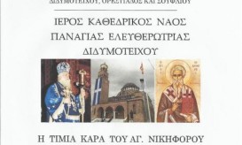 31 Μαΐου 2013 14:02 Η Τίμια Κάρα του Αγίου Νικηφόρου στο Διδυμότειχο Πλήθος κόσμου παρευρέθηκε στην υποδοχή της Τίμιας Κάρας του Αγίου Νικηφόρου,τον Ιερό Καθεδρικό Ναό Παναγίας Ελευθερώτριας Διδυμοτείχου, παρουσία του...