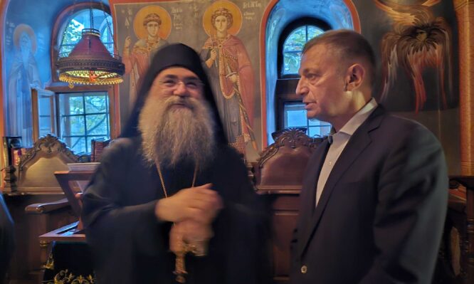 Μετά του παρασχέθηκε το παραδοσιακό κέρασμα και παρακάθησε στην μοναστηριακή τράπεζα μαζί με τους πατέρες και τους λαϊκούς προσκυνητές της Μονής.