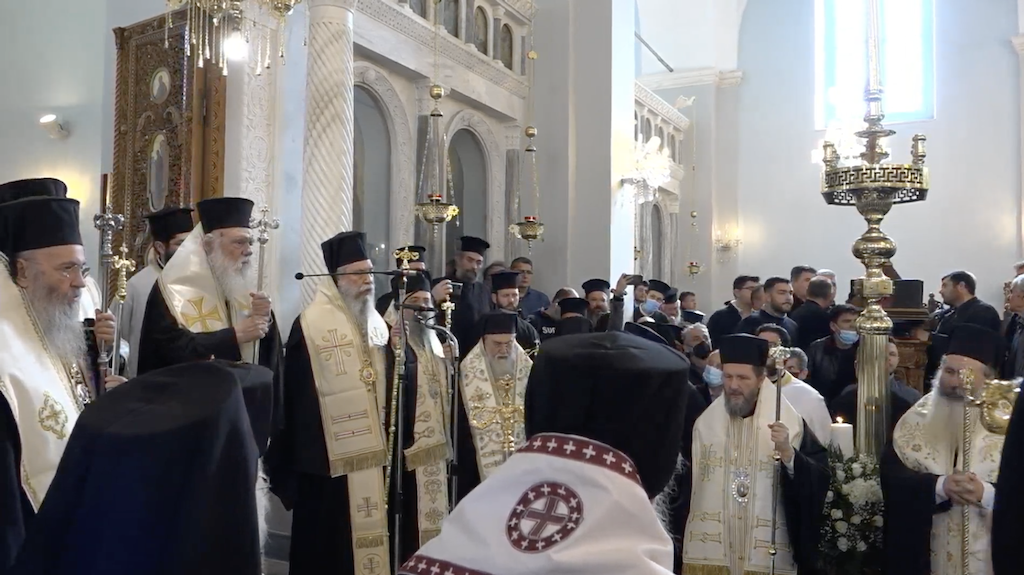 Σήμερα το πρωί από ώρα 7 έως 10.30 π.μ. τελέστηκε ο Όρθρος και η Αρχιερατική θεία Λειτουργία υπό του Σεβασμιότατου Μητροπολίτου μας κ. Αθανασίου Β’, ενώ στις 1 μ.μ. ξεκίνησε η Εξόδιος ακολουθία υπό του Μακαριοτάτου Αρχιεπισκόπου Αθηνών και πάσης Ελλάδος κ.κ. ΙΕΡΩΝΥΜΟΥ με την συμμετοχή πλειάδος Αρχιερέων.
