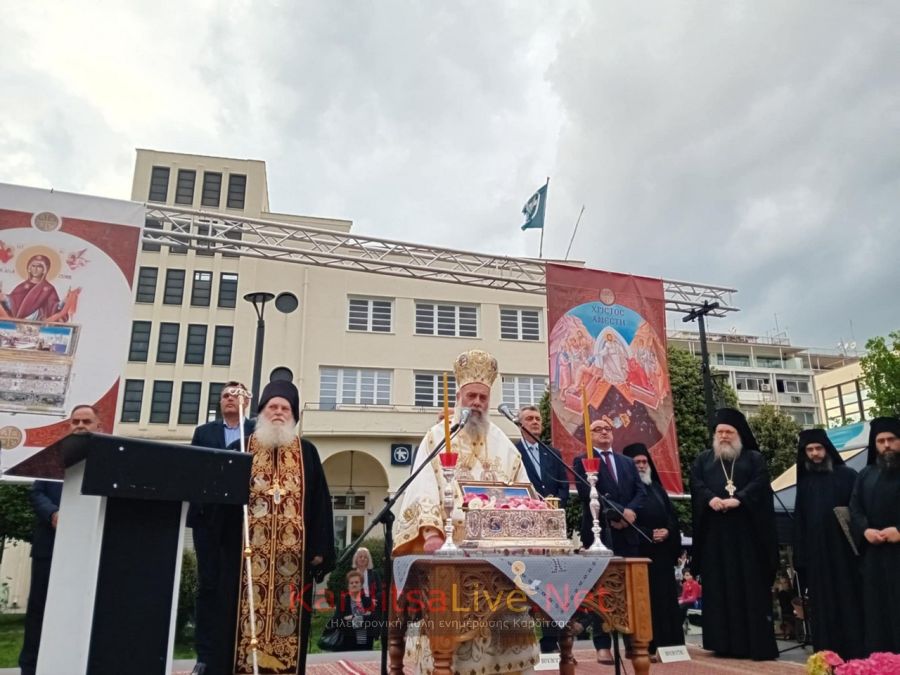 Από ειδική εξέδρα, χαιρετισμό απηύθυνε ο Δήμαρχος Καρδίτσας κ. Βασίλης Τσιάκος, ο οποίος εξέφρασε τη συγκίνησή του για τη μεγάλη αυτή ευλογία που δέχεται η πόλη. Παρόντες ήταν επίσης εκπρόσωποι της πολιτικής ηγεσίας, μεταξύ των οποίων ο Υπουργός Αγροτικής Ανάπτυξης και Τροφίμων και Βουλευτής Καρδίτσας κ. Κωνσταντίνος Τσιάρας.