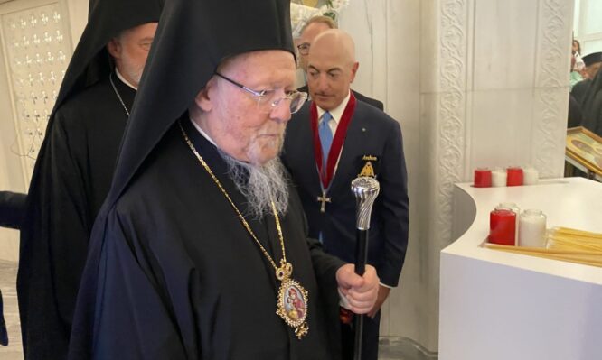 Ο Παναγιώτατος Οικουμενικός Πατριάρχης Βαρθολομαίος φθάνει στον ναό και Εθνικό Προσκύνημα του Αγίου Νικολάου.. (Φωτογραφία: Ευανθία Καρατζά)