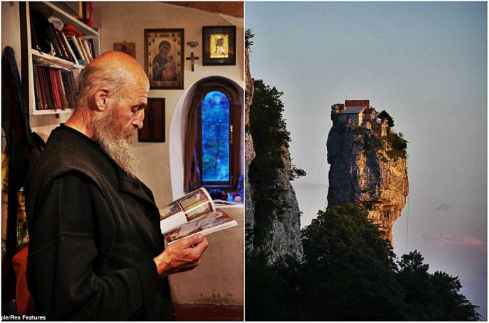 Ο ίδιος κατεβαίνει μόνο δυο φορές την εβδομάδα για να προσευχηθεί στο μοναστήρι στους πρόποδες του βράχου.