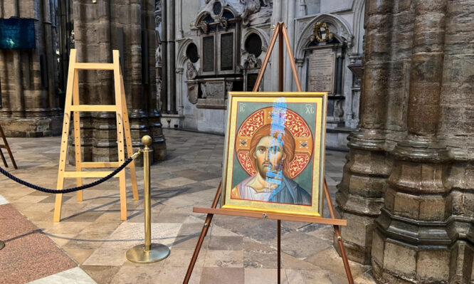 Σημαντική ήταν η συμβολή της Ιεράς Αρχιεπισκοπής στην τελετή, με την προσφορά δύο ιερών εικόνων στο Αββαείο. Η μία εξ αυτών, η εικόνα του Χριστού, τοποθετήθηκε σε περίοπτη θέση στον κυρίως ναό. Σε μια ιδιαίτερη στιγμή κατά τους χαιρετισμούς που ακολούθησαν, ο Σεβασμιώτατος ενημέρωσε την Αυτού Μεγαλειότητα, τον Βασιλιά Κάρολο, πως η συγκεκριμένη εικόνα προσφέρεται ως δώρο της Αρχιεπισκοπής προς το πρόσωπό του, «για να τον προστατεύει». Ο Βασιλιάς αποδέχθηκε την ευγενική αυτή χειρονομία εκφράζοντας ευγνωμοσύνη και ευχαριστίες.