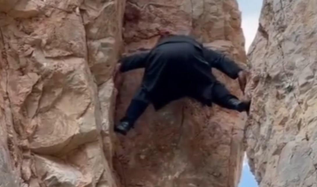 Απόλυτα εξοικειωμένος με τη φύση, ο μοναχός διακρίνεται καθαρά να σκαρφαλώνει στη βραχώδη και απότομη περιοχή «Καρούλια», η οποία βρίσκεται υπό τη δικαιοδοσία τη Μονής Μεγίστης Λαύρας.